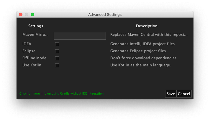 這裡可以做其他設定。比如開發環境是 Intellij 就可以選 IDEA,它就會幫我們自動產生需要的檔案。如果想改用 Kotlin 也可以選 Use Kotlin。