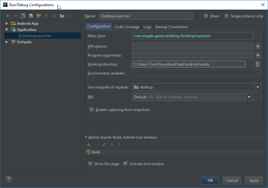 - 將 Working directory 指向 android/assets 或是 core/assets (假如沒有 android 資料夾)。