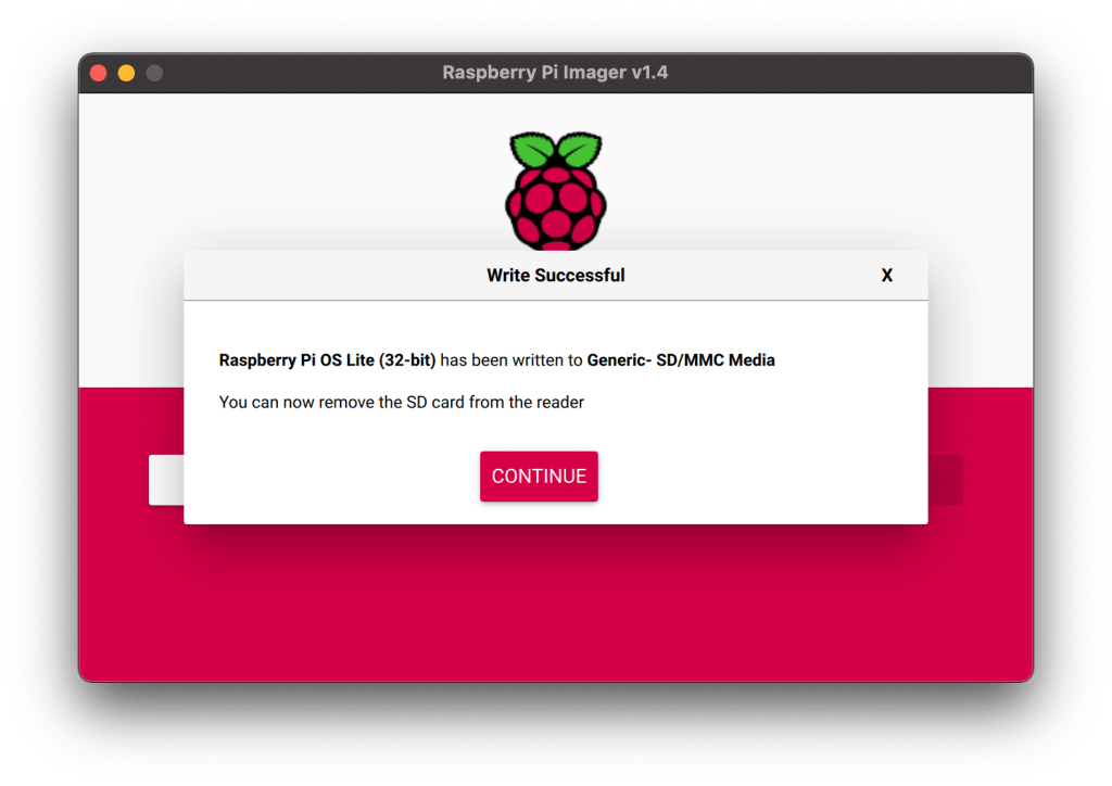 完成之後就會看到這個畫面。這時我們就可以將記憶卡從讀卡機移除,然後插上 Raspberry Pi 開機了!