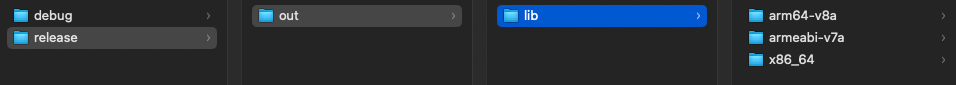 - 在 [PROJECT]\build\app\intermediates\merged_native_libs\release\out\lib 這個資料夾底下,可以找到三個資料夾: